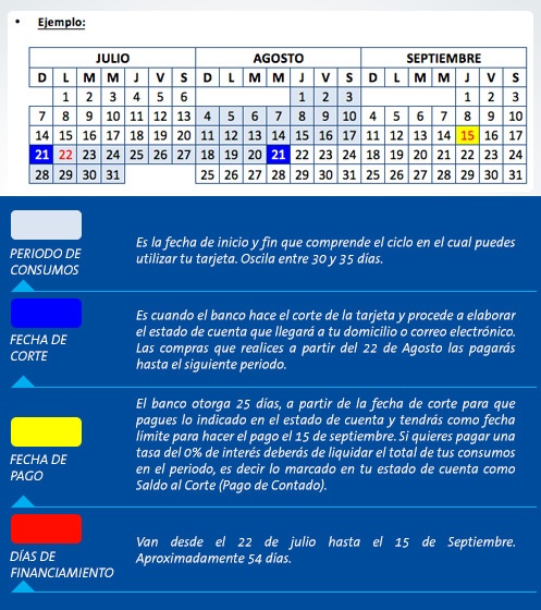 - Fecha de corte: Es la fecha que determina el final e inicio de un período de consumos. Por ejemplo, si tu fecha de corte es el 21 de cada mes, y estamos en el mes de agosto, los consumos que realices del 21 de Julio al 21 de agosto pertenecerán al período de agosto. Todas las transacciones que hayas realizado se reflejarán en tu estado de cuenta y el saldo de este período es el que deberás pagar en la fecha de pago para evitar cargos de intereses. Si deseas financiarte, puedes realizar el pago mínimo.