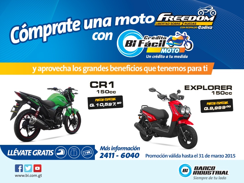 ¡Bi Fácil Moto y Freedom te regalan el casco, el chaleco y las placas, al comprar los modelos CR1 150cc y Explorer 150cc durante febrero! No dejes pasar la oportunidad de pagarla hasta en 36 cuotas con la tasa más baja del mercado.